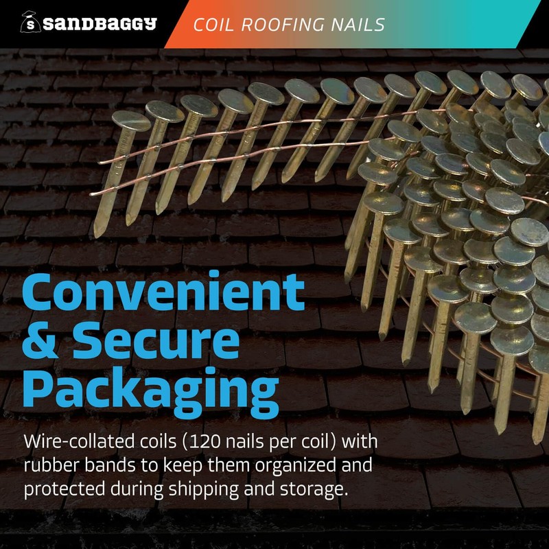Sandbaggy 1-1/4" Coil Roofing Nails For Shingles - 15 Degree - Galvanized - Wire Collated, 11 Gauge - 120 Nails Per Coil (10)