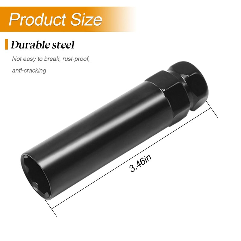 - Universal Vehicle Compatibility: This six slot lug nut socket measures 3.46 x 0.79 inches with a 0.67 inch inside diameter and is compatible with M12x1.5, M12x1.25, 1/2- 20, M10x1.25, 3/8 - 20 threaded pitch splined lug nuts and 19mm (3/4")and 21mm (13/16") hex socket wrench for a wide variety of sedans, SUV, light trucks, and commercial vehicles for roadside emergencies, tire changes, brake service, and wheel customization, etc.