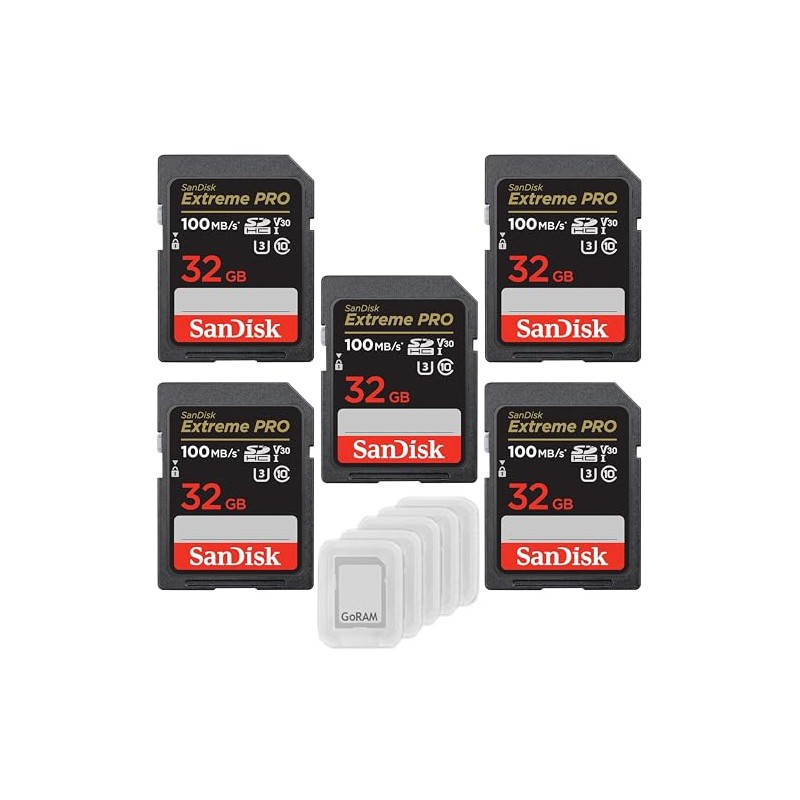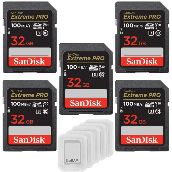 SanDisk 32GB (5 Pack) Extreme Pro SDHC UHS-I Class 10 SD Camera Card C10, U3, 4k UHD, V30 SDSDXXO-032G-GN4IN Bundle with (5) GoRAM Cases