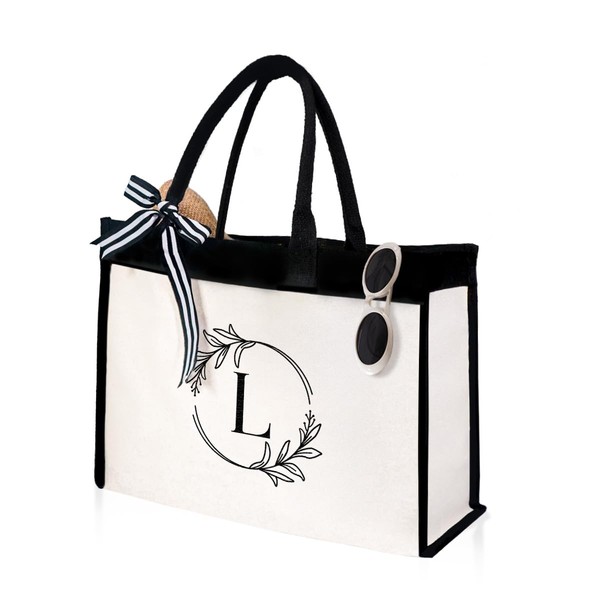 SANDJEST Letter A Monogrammed Canvas Tote Bag Embroidered Initial Beach Totes Bags Gifts for Women Friend Coworker Bridesmaid, Initial L, Medium