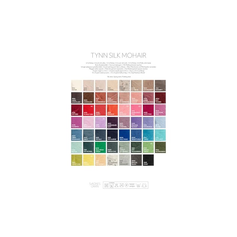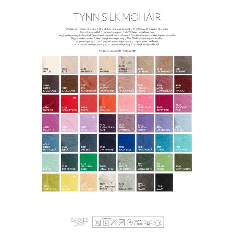 TYNN SILK MOHAIR, as the name suggests, represents the thinnest silk mohair yarn from Sandnes yarn. This blend of the finest mohair, wool and silk combines softness and luxury. The yarn is characterised by its delicate texture and a generous running length. With TYNN SILK MOHAIR, light and airy knitted pieces are created with a touch of luxury. If you use TYNN SILK MOHAIR as a side yarn in combination with other qualities, the knitted piece not only gets an effective look, but also a firm hold. Mohair, derived from the angora goat, is characterised by long, silky smooth and curly hair. The addition of conventional wool gives the yarn robustness and volume. The silk adds to the strength and shine of the yarn, especially when the fibres are brushed on, giving it a soft, light and airy texture with a fluffy look.