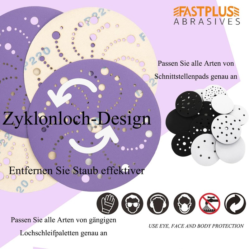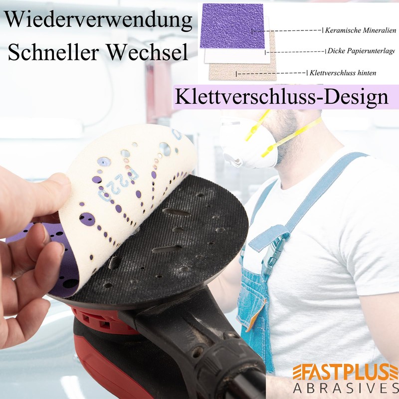 - Ceramic grain: the purple sandpaper 150 mm Velcro are designed with ceramic abrasive, which has a strong grinding power. Compared to other high-quality abrasives, the cutting speed is 30% faster, the cutting performance increased by 30% and the service life is extended by 30%. The low consumption leads to excellent results.