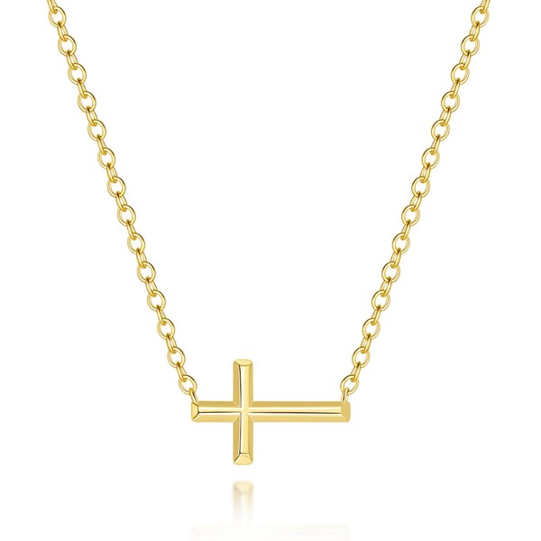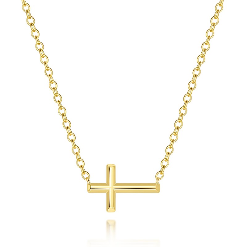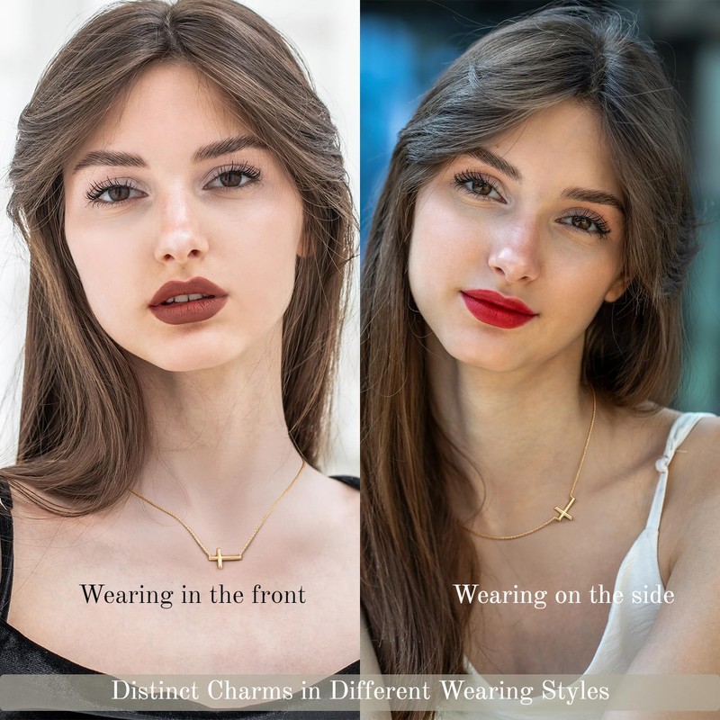 - [CREATE YOUR OWN LOOK] This gold plated cross necklace for women is ideal for stacking. Pair this gold cross necklaces for women with dainty chains, Y-necklaces, or other pendants to play with shapes and lengths. The sideways gold cross pendant becomes a subtle statement piece that enhances your unique style