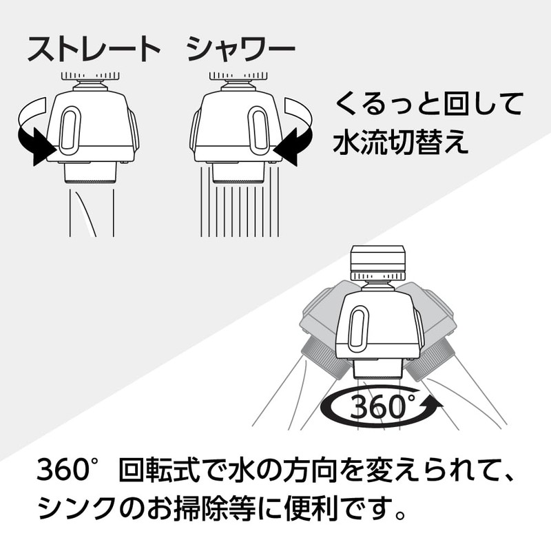 - 【くるっと回して流水切替】本体を90度回す毎にストレートとシャワーの切替えができます。シャワーはすすぎや、食器洗い機の予備洗いに適しています。ストレート水流は水ハネしにくい泡沫吐水です。