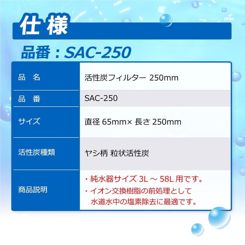 Set Contents: Activated carbon filter, 9.8 inches (250 mm); Size: Φ2.6 x 9.8 inches (65 x 250 mm); Activated carbon type: granular and palm pattern; Product description: For use with 9.8 - 12.8 gal (3 - 58 L) cartridges. It is used as a pretreatment for ion exchange resins, such as removing chlorine in tap water. [Features] Uses high performance palm shells and is an ideal activated carbon filter for removing chlorine (calcium) in tap water. The end is sealed with a gasket to ensure no leaks of raw water or activated carbon. (Cartridge Pure Water Supplies) Perfect for washing cars, aquariums, and parts cleaning. The ionic ingredients contained in tap water are used for applications that may damage aesthetics and affect other components. It is also used for steam water such as humidifiers, glass washers, and diluted water. [Warranty and Maintenance] The cartridge pure water unit comes with a 1 year warranty. We also provide regeneration of used ion exchange resin and replacement of ion replacement resin. We are dedicated to providing after-purchase support and solving problems for years of reliable use.