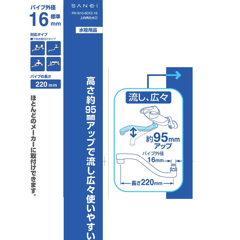 SANEI PA1610-60X2-16 Upward Pipe, Square Shape, Height 3.7 inches (95 mm), Length 8.7 inches (220 mm)