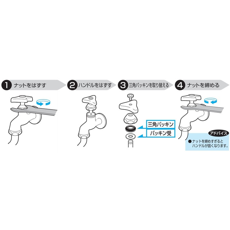 - Caution for Replacement: Please be sure to close the shut-off valve and perform work. After replacing the top gasket, if the top nut is too tight, the handle will become heavy. Be careful not to overtighten