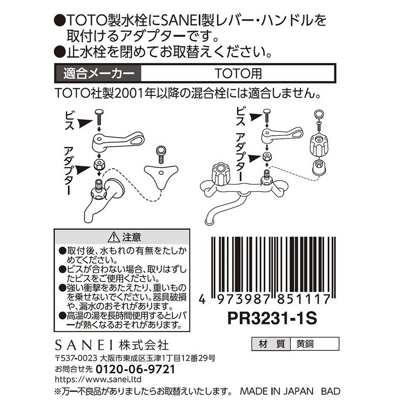 - Metal adapter to attach SANEI lever handles to TOTO faucets