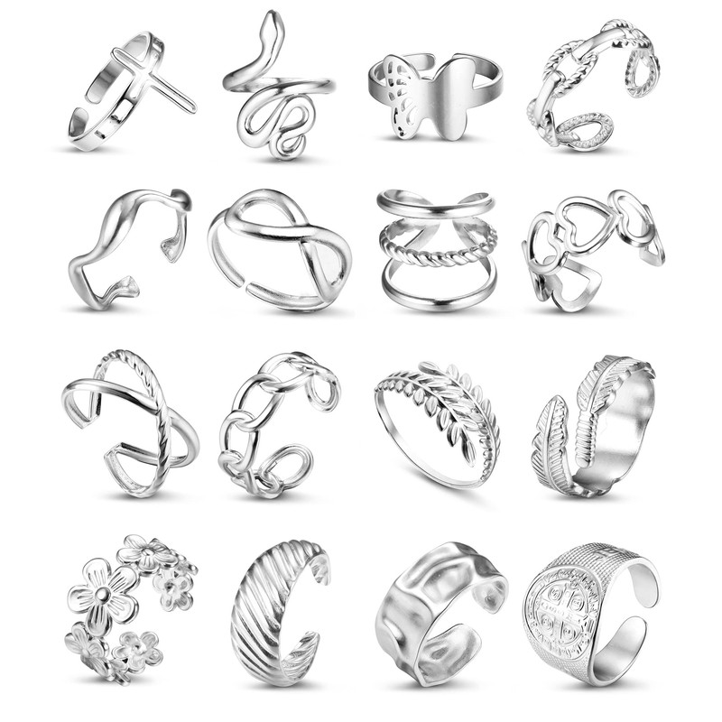 Sanfenly 16Pcs Stainless Steel Rings for Women Open Knuckle Stackable Rings Adjustable Aesthetic Silver Rings Snake Leaf Feather Butterfly Chunky Thumb Finger Rings Trendy Simple Statement Rings Non Tarnish Indie rings