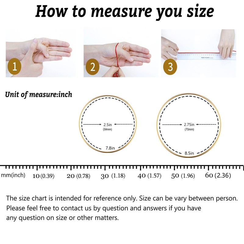 - DIMENSION:Bangle Length 7.8-8.5", Inner Diameter: 64-70mm.