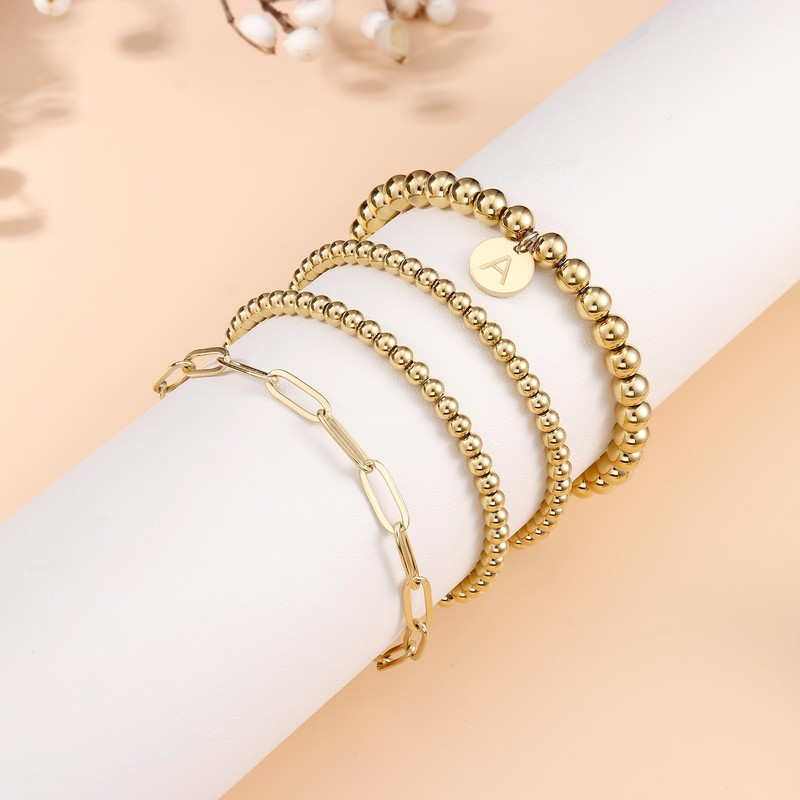 • Initial Bracelets for Women Trendy: Dainty initial bracelet for women set includes 4 pieces stackable bracelets for women. Comprising 2 simple 4mm small gold beaded bracelets, 1 6mm large gold bead bracelets featuring an engraved letter "A" disc charm and 1 piece paperclip chain bracelet, this gold bracelet stack can be worn individually or layered for a stylish look