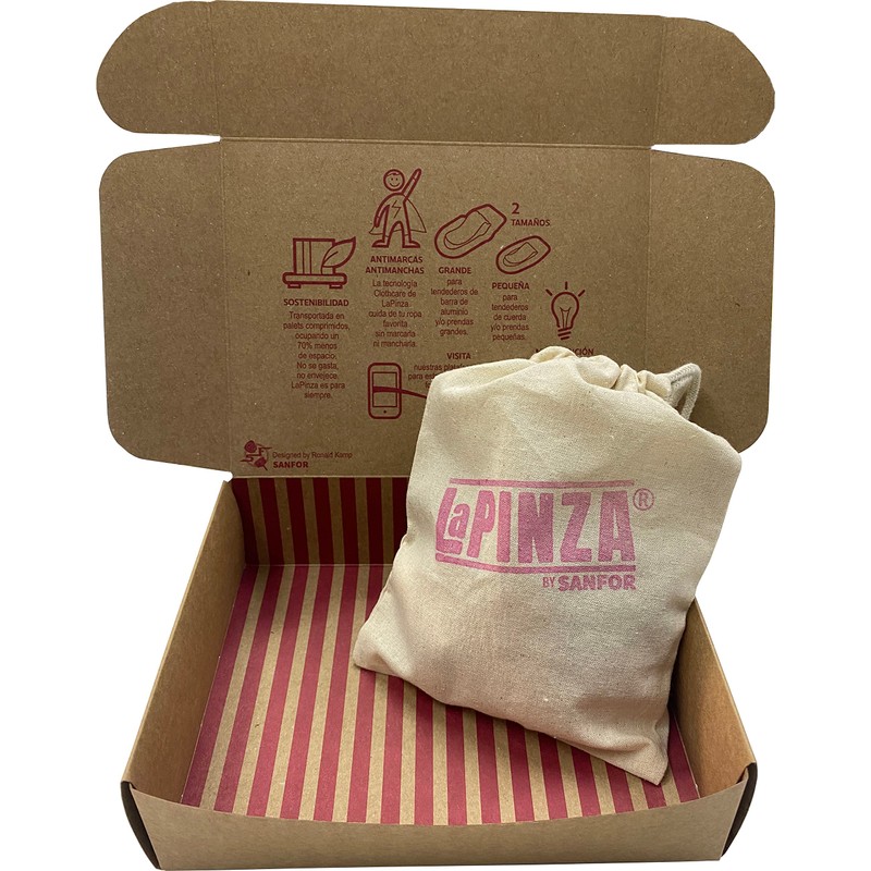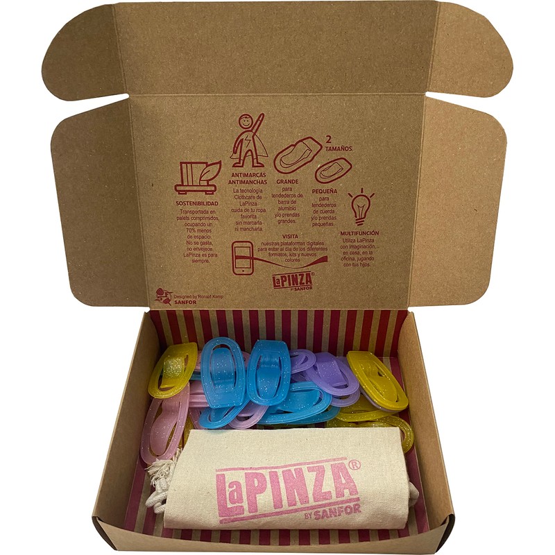 - Box contains: 28 pieces of LaPINZA in 4 different colours. A cotton bag for use and storage. The clamp is suitable for washing line or thin bar. The clamp measures 59mm x 30mm. The 15 x 12 cm cotton bag replaces the traditional basket and takes up 75% less space.