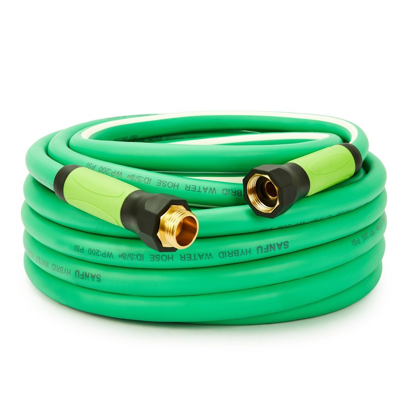 - 🍃【EASY TO USE】- SANFU Hybrid garden hose has 50 foot long, equiped with swivel grip handle for easily threading the fittings onto a hose bid. Solid Brass 3/4" GHT fittings for abasion resistance and long time use. Rubber washer for no leaking connection.