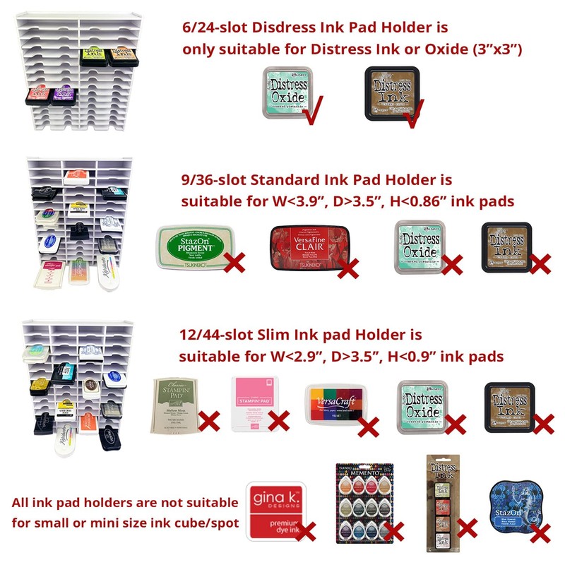 - 44 slots ink pad holder. Overall size: 12.6"W x 4.3"D x 12.8"H. Opening is 2.9” W and 0.9” H. Suit for displaying W<2.9'',H<0.9'' ink pads, such as VersaFine Clair and Stazon Pigment of TSUKINEKO, Ranger ink pads and many more slim sizes. Not for Stampin' Up, Versa Craft, ink spots/cube, Distress Inks and Distress Oxide.