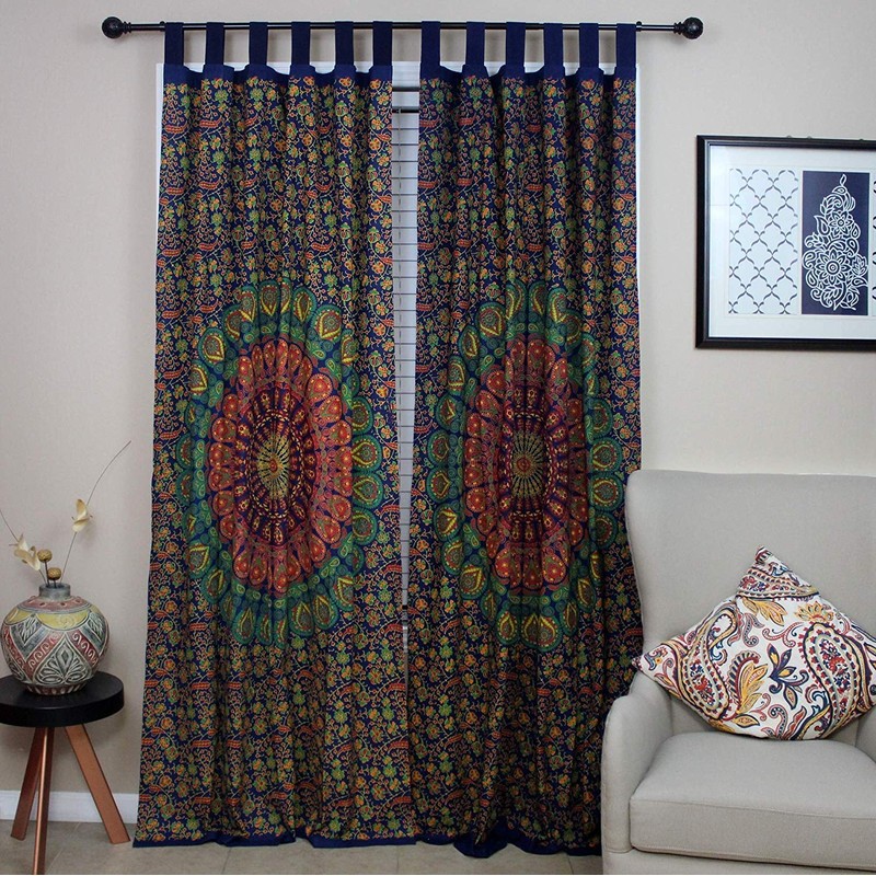 - IMPECCABLE SANGANER FLORAL MANDALA DESIGN: This ravishing tab top 100% Cotton Sanganer curtain is embellished with a gorgeous floral motifs in vibrant colors on a deep dark blue background. The center mandala peacock design has a beautiful combination of Green, Orange, Red and Gold colors
