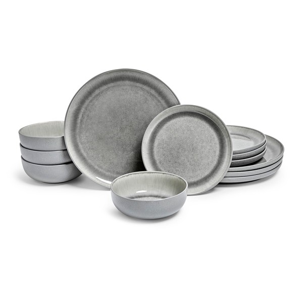 Sango Asher 12-Piece Stoneware Dinnerware Set – Service for 4, Modern Gray with Reactive Glaze, Perfect for Everyday Dining & Entertainment, Microwave & Dishwasher Safe