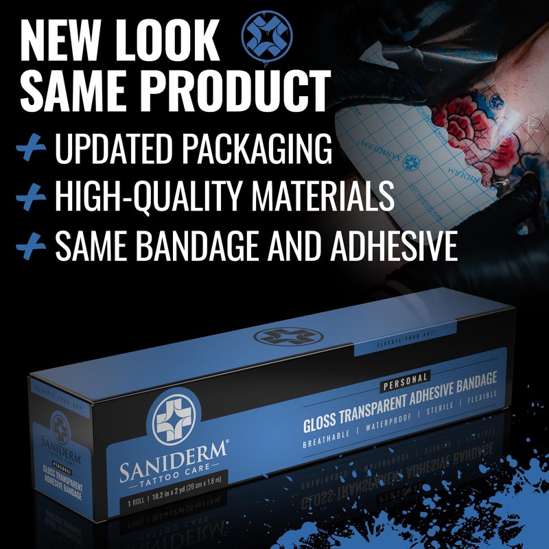 • THE ORIGINAL TATTOO AFTERCARE BANDAGE C Saniderms Original Gloss Bandage is the tried-and-true, industry-defining tattoo aftercare bandage. Dermatologist-recommended and trusted by expert tattoo artists worldwide, this medical-grade bandage ensures your tattoo heals quickly, safely, and more vibrantly. With over a decade of experience and millions of tattoos healed, its the perfect way to heal your ink.