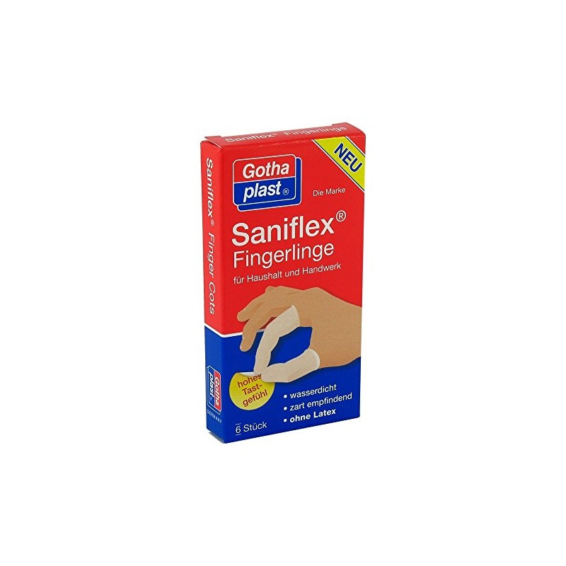 - Saniflex finger cots protect the fingers of the creating hand from superficial mechanical injuries and from weakly aggressive detergents with reversible effect.