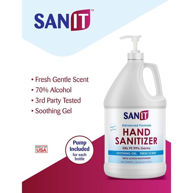 Sanit Moisturizing Hand Sanitizer Gel 70% Ethyl Alcohol - Kills 99.99% Germs, Advanced Formula with Vitamin E and Aloe Vera - Soothing Gel, Fresh Scent, Made in USA - 1 Gallon with Easy to Use Pump