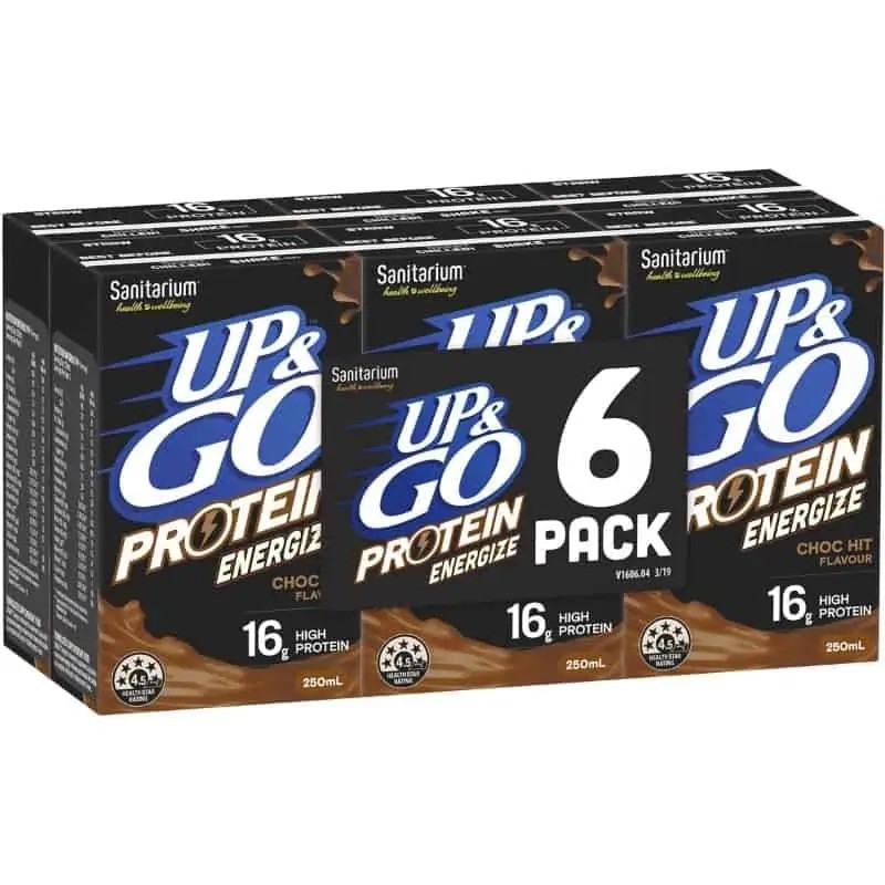 Sanitarium UP&GO Protein Energize Choc 250ml multipack is a single serve high protein on the go breakfast drink.