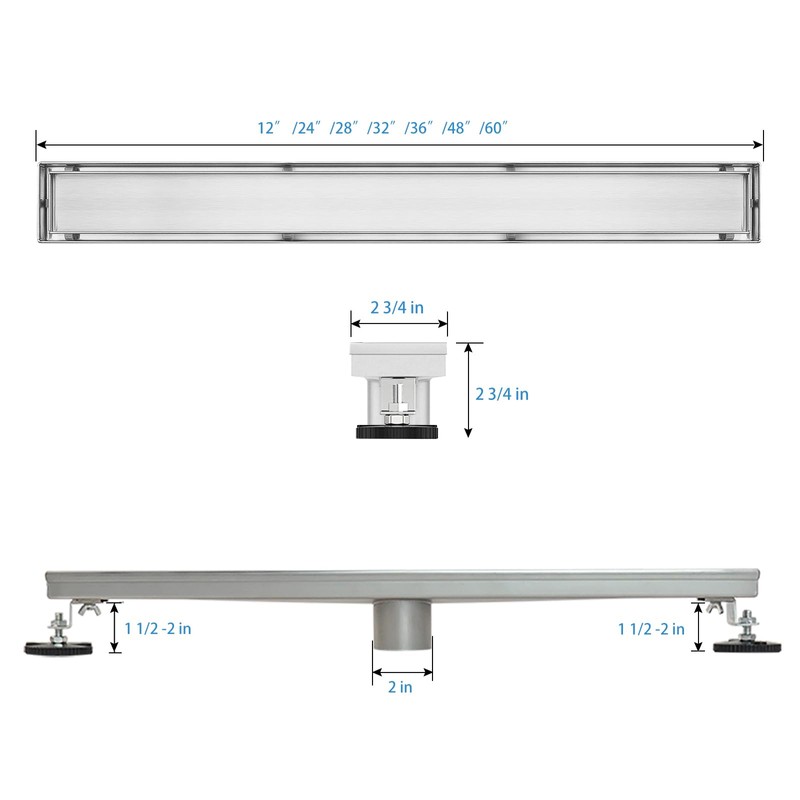 - ▶ [Specifications and displacement] The size of linear drain is 24 inches in length and 2.75 inches in width. The diameter of outlet is 2 inches. According to the engineering mechanics improved X-shaped Diversion Groove, it can be achieved high displacement with an average of 60 l/min (without filter mesh). It can remove the residual moisture at the bottom effectively