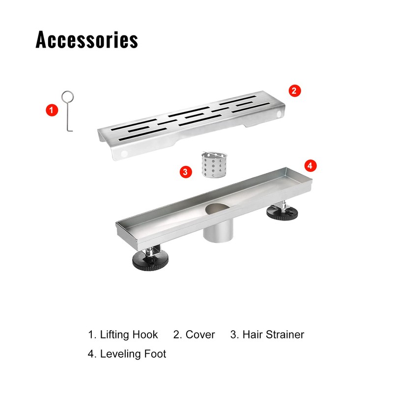 - 【Easy to Install and Clean】Shower Drain comes with two adjustable feet ,It can solve the installation problem effectively caused by the unevenness of the ground.After using for a period of time, open the panel of linear shower drain and take the filter mesh out. Washing the filter mesh with water.