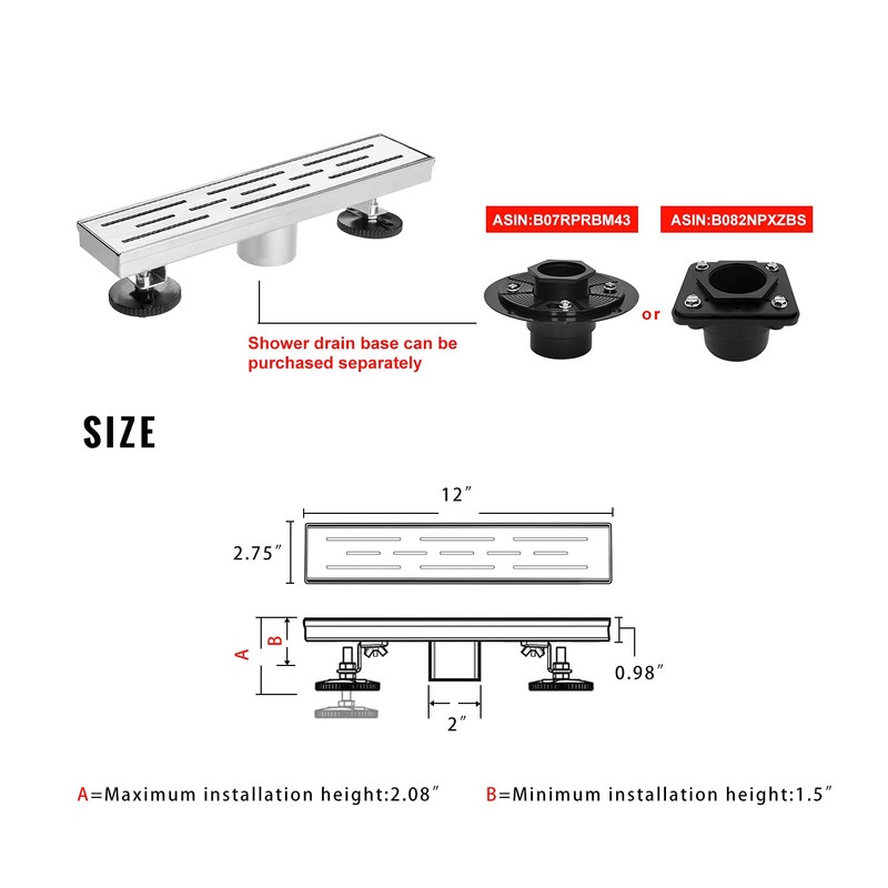 - 【Specification】Linear Shower Drain Size: 12 x 2.8 x 2.5" The diameter of outlet is 2",high displacement with an average of 60 l/min (without filter mesh).