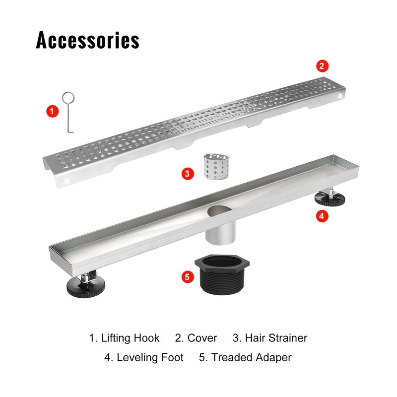 • ▶ [Description of Accessories]Open the panel from both sides of the shower drain 60 INCH by using a hook, the strainer can filter hair and particulate impurities effectively. Adjustable feet can solve the installation problem effectively caused by the unevenness of the ground. Threaded joints with rubber ring to adjust the height of the drain. It can be used with all 2-inch PVC, ABS and cast iron drain fittings on the market to secure the drain to the flange and to prevent water