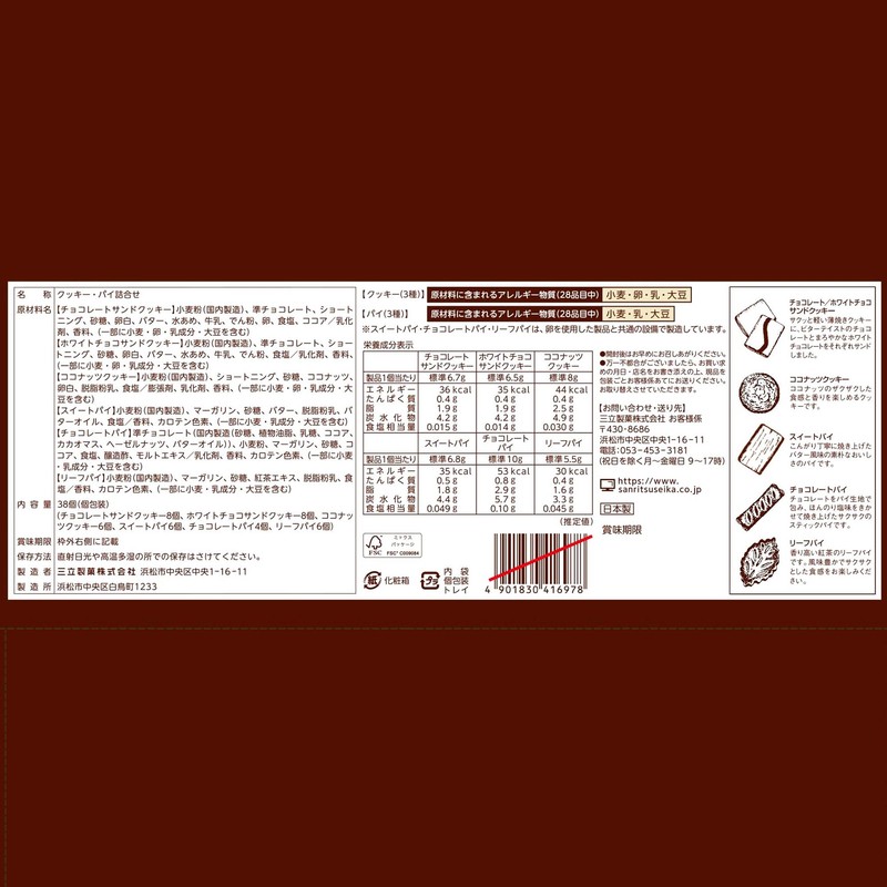 • Ingredients: Chocolate Sand Cookie: Flour (made in Japan), semi-chocolate, shortening, sugar, egg white, butter, corn syrup, milk, starch, egg, salt, cocoa / emulsifier, flavoring (some may contain wheat, egg, dairy ingredients, soybean); White chocolate sand cookies: Flour (made in Japan), semi-chocolate, shortening, sugar, egg white, butter, syrup, milk, starch, salt/milk Compensator, Fragrance, Some parts include wheat, egg, dairy ingredients, soybeans; Sweet pie: Flour (made in Japan), margarine, sugar, butter, powdered skim milk, butter oil, salt/antioxidant (vitamin E, tea extract), flavoring, carotene pigment, (including wheat, dairy ingredients, soybean); Coconut cookies: Flour (made in Japan), shortening, sugar, coconut, egg white, skim flour, milk powder. salt/expander, milk Degreaser, fragrance, (including wheat, egg, dairy ingredients, soybean); Leaf pie: Flour (made in Japan), margarine, sugar, tea extract, powdered skim milk, salt/flavoring, carotene pigment, some parts include wheat, dairy ingredients, and soybeans