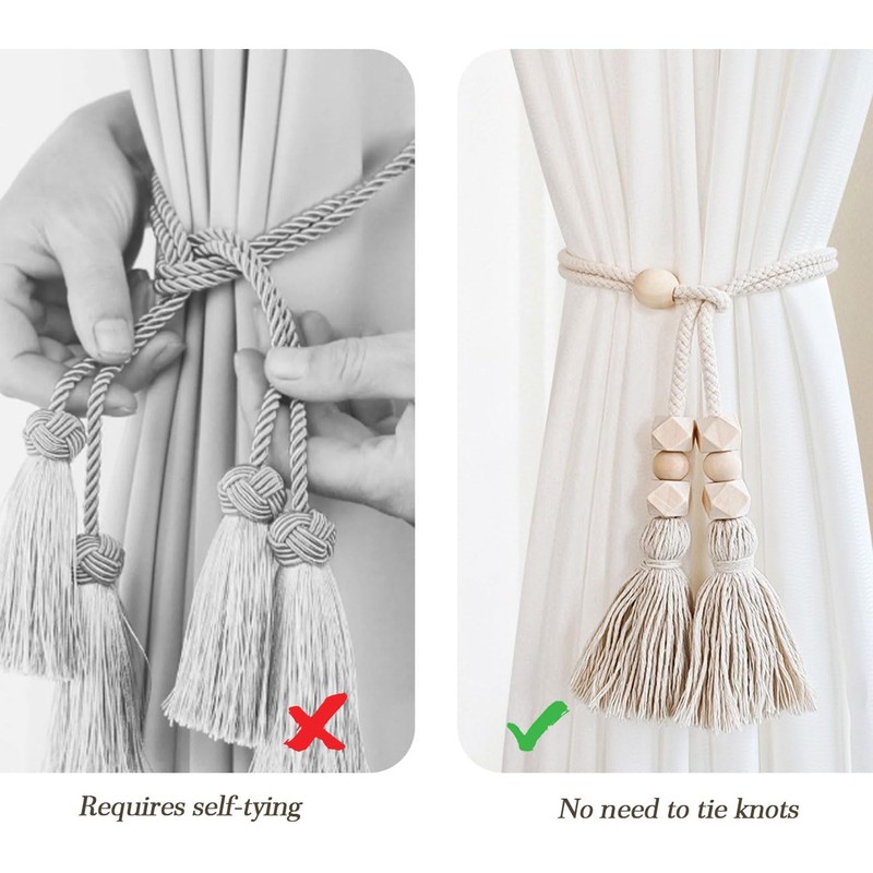 - Easy Use: The drapery holdbacks are designed with long rope and Removable wooden bead/cube in the end, you can tie up the curtains easily by fastening the cord loop. Or you can just tie a knot.Two ways of binding, no need for curtain hooks.