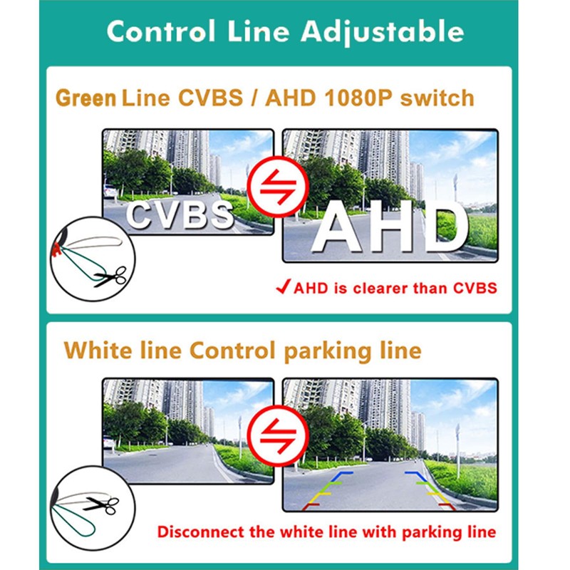 - DUAL CONTROL CABLE: Supports AHD 1080P and CVBS video signals. Its output video signal defaults to CVBS. If you need to connect an AHD monitor, please cut off the green cable on the camera and reconnect the power supply. The guidance can be adjusted on or off, and when you get it, it defaults to having a reference line. If you do not need a guide wire, please cut off the white circuit and reconnect the power supply