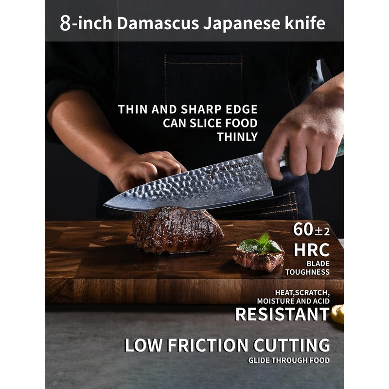 • Premium Blade: This is a chef knife type, which is made of 67 layers of Damascus steel, the core layer is VG10 material, wrapped by 33 layers of high-quality high-carbon stainless steel layers on each side to ensure excellent strength, toughness and durability. The slender blade design achieves high-precision cutting, and the forged surface is polished to minimize drag for jelly-smooth cuts and enhanced non-stick performance