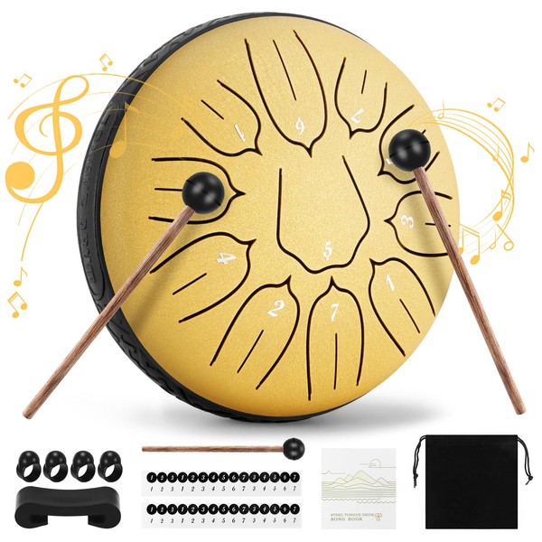 Sannofair Rain Drum for Outside, Steel Tongue Drum 11 Notes 6 Inches Chakra Tank Drum, for Yoga Musical Education,with Drumsticks Drumstick Stand Tutorial Book Note Stickers Finger Cots(Gold)