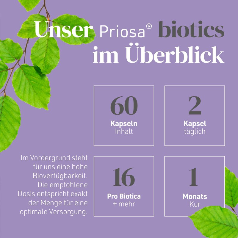 - Priosa Biotics - a complex for the restoration of the intestinal flora, consisting of 2 capsules with natural micro-organisms + fibre. The 1st Capsule optimises the intestine with plant + mineral prebiotics. The 2nd Capsule contains probiotics