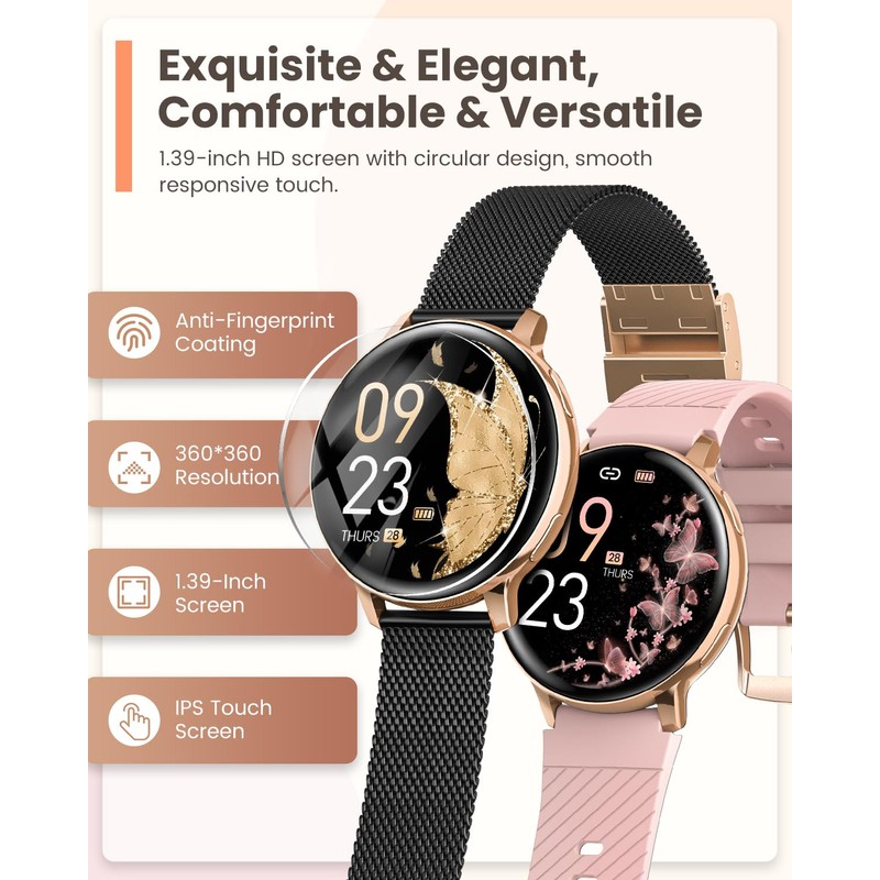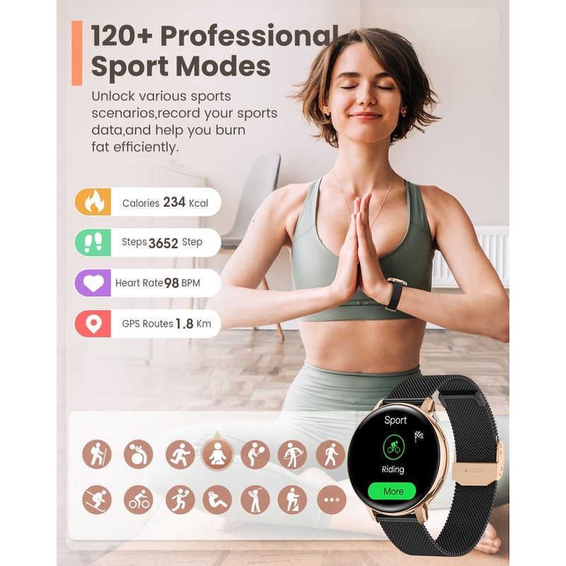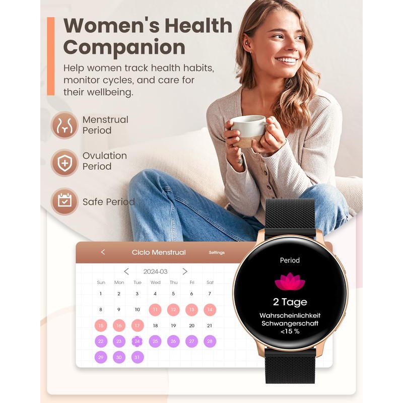 Sanorum Women's Smart Watch with Call, 1.39 Inch Smartwatch with Female Function, IP68, Heart Rate, Sleep, Pedometer, 120+ Sports Modes, iOS Android Gold Black