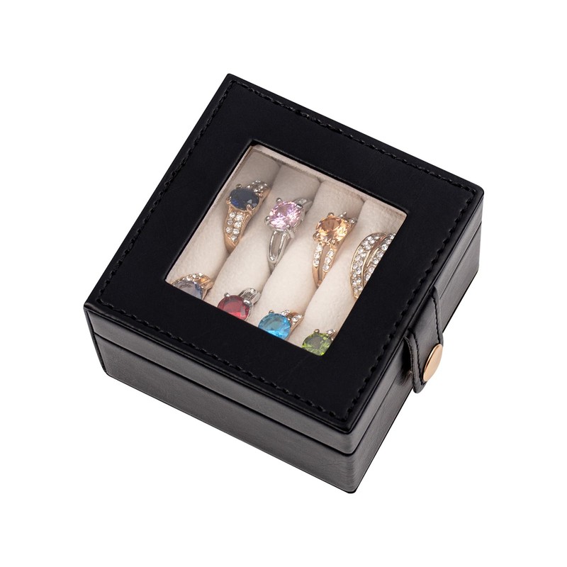 SANQIANWAN Small Leather Jewelry Box with Glass Top Mini Ring Display Case with 4 Slots for Selling Gift for Girls and Women (Black)