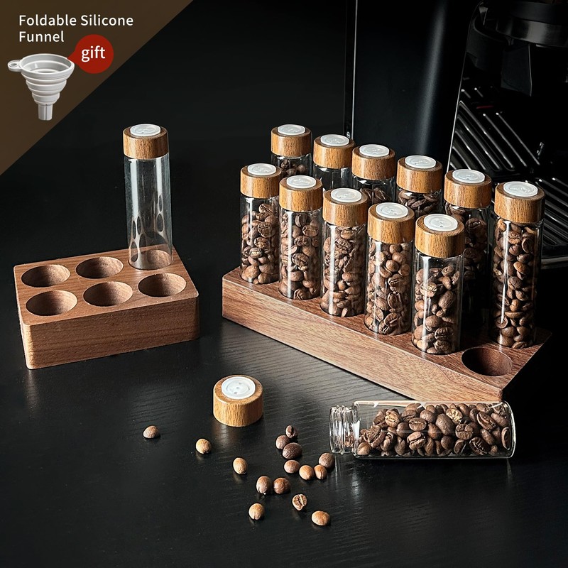SanSLicoo Single Dose Coffee Bean Storage Tubes with Exhaust Valve, 12pcs Coffee Bean Cellar Dosing Glass Vials With Wooden Display Stand + Funnel, for Tea, Coffee, Spices