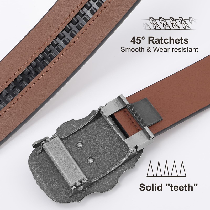 - Hebilla automática inspirada en Rodeo: el cinturón de carraca tiene una hebilla automática occidental, con gran artesanía especial. El cinturón vaquero de carraca es fácil de hacer un ajuste rápido. Simplemente desliza el cinturón de carraca en la hebilla y tira del cinturón de piel, la hebilla del cinturón se bloquea automáticamente. Para liberar el cinturón de vaquero, presiona un pequeño botón en el lateral de la hebilla.