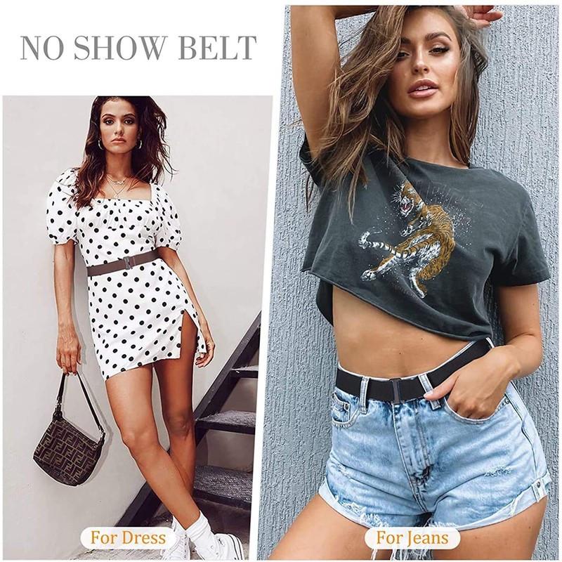 - [ No Show Womens Belt ] The stretch belt is just an elastic band with a flat metal closer. The flat buckle lies flat that when wearing a t-shirt and jeans there is no show any bulge. Perfect solution to the large waistband problem without bulging buckles of regular belts. The glide adjustment is designed to sit toward the back of the pant. The no show belt gives you flat stomach feel with no gapping back! No more wearing a t-shirt and tank top under clothes to keep the "back crack" covered!