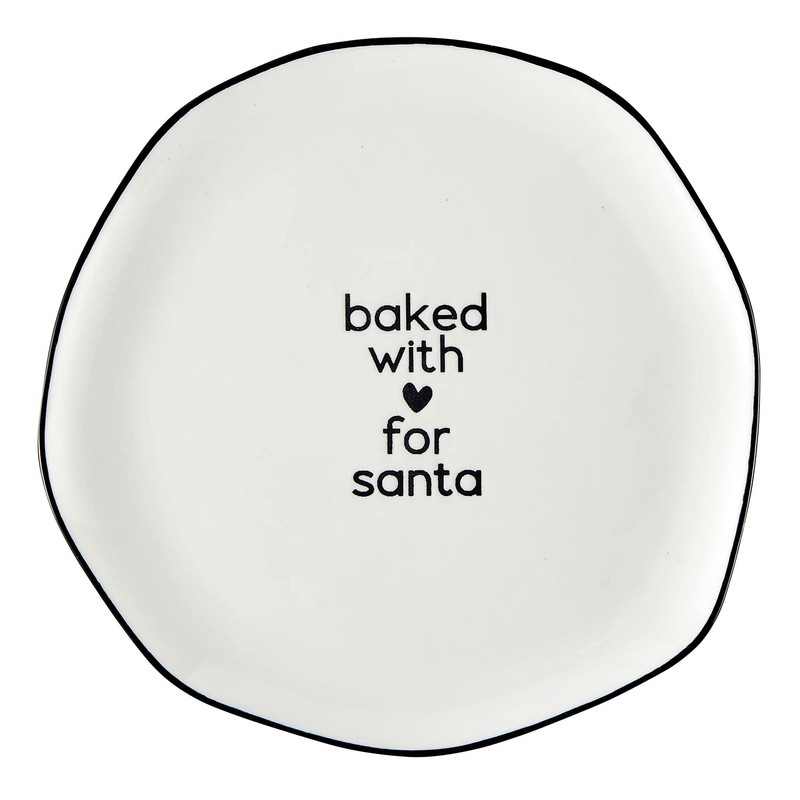 - WHITE CERAMIC with a stylish black rim; reads "Baked with love for Santa"