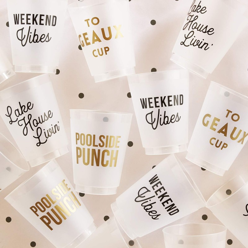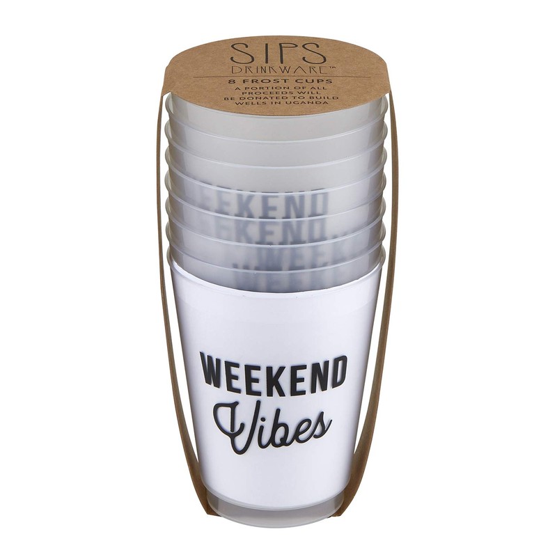 • BLACK PRINT: White frosted cup; reads "Weekend Vibes"