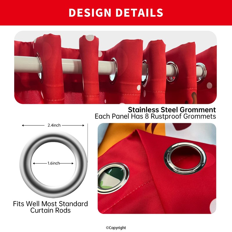 - Ready Made - Includes 2 x Curtain Panels. Each panel measures 52" wide, available in 45", 63", 84", 95", 108", and 120" lengths. Each pair of blackout curtains are nicely finished with 8 rust-proof grommets. Each grommet has 1.6" inner diameter that fits most standard curtain rods. The rust-proof loops are easy to install and give the curtain years of use without tearing up the edges. Please measure size before buying.