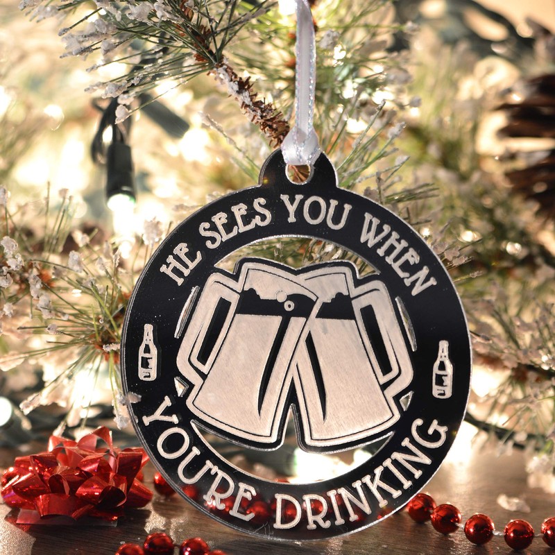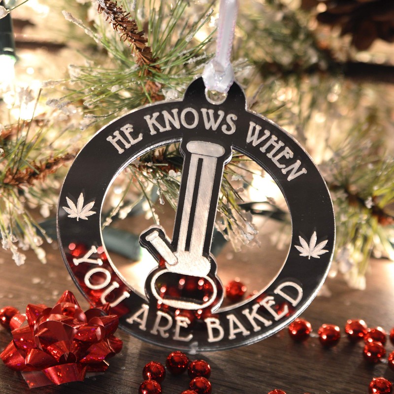 Santa Knows Mirror Acrylic Christmas Tree Ornament Pair, He Sees You When You are Drinking, He Knows When You are Baked Ornament Set