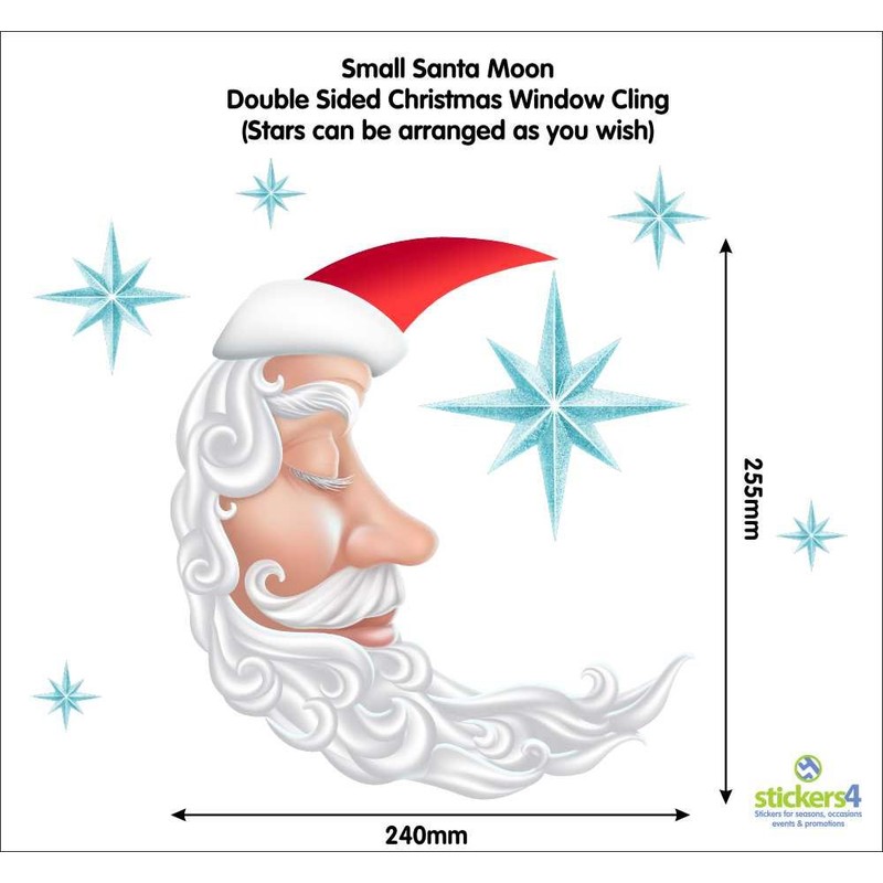 • Beautiful full colour Santa Moon & Stars. The small version measures approx 255mm tall x 240mm wide (that's about 10" x 9.5") Kids will love this wonderful Christmas design. Easy to apply AND reusable. Stars are supplied as separate items so can be placed wherever you like. Full instructions included. Made in the UK by Stickers4