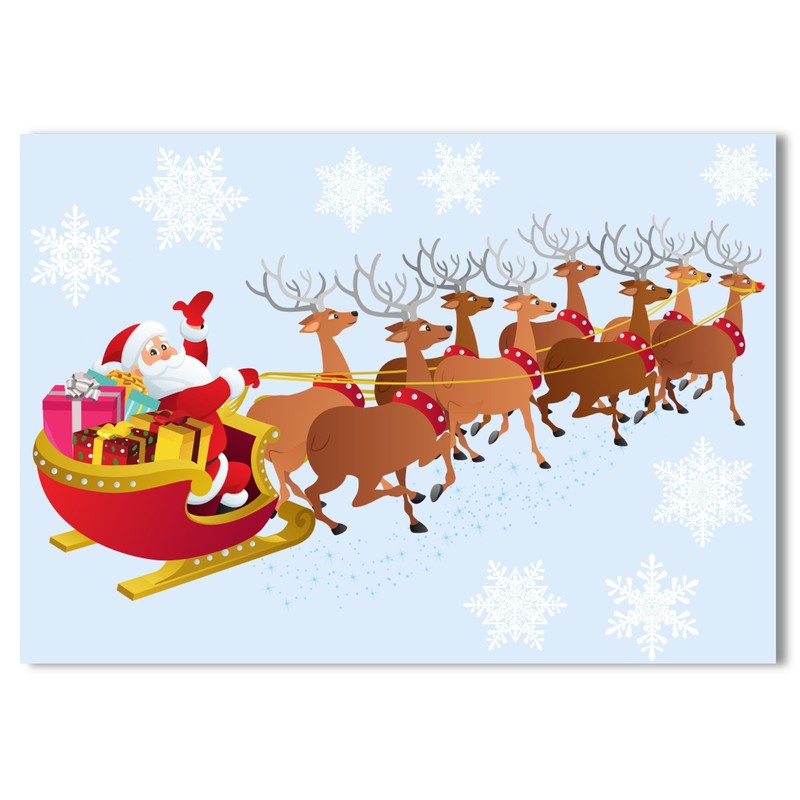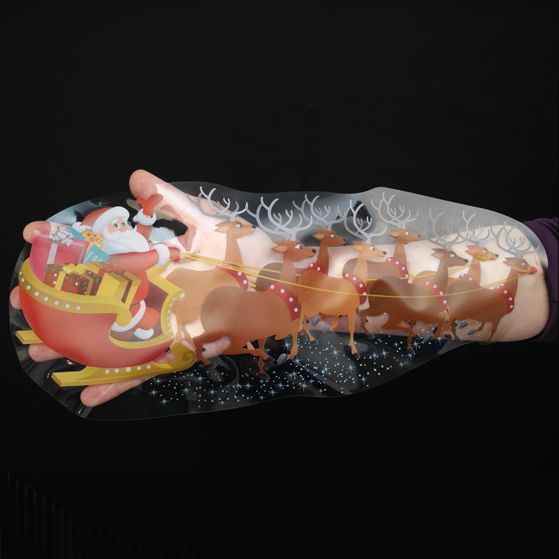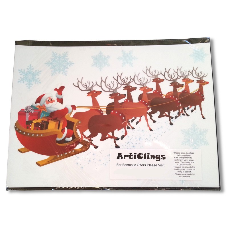 - A pack contains 1 Sheet of Santa on his Sleigh being pulled by 8 reindeer, with 8 removable snowflakes, and 2 sheets of 28 snowflakes window clings, 14 different designs.