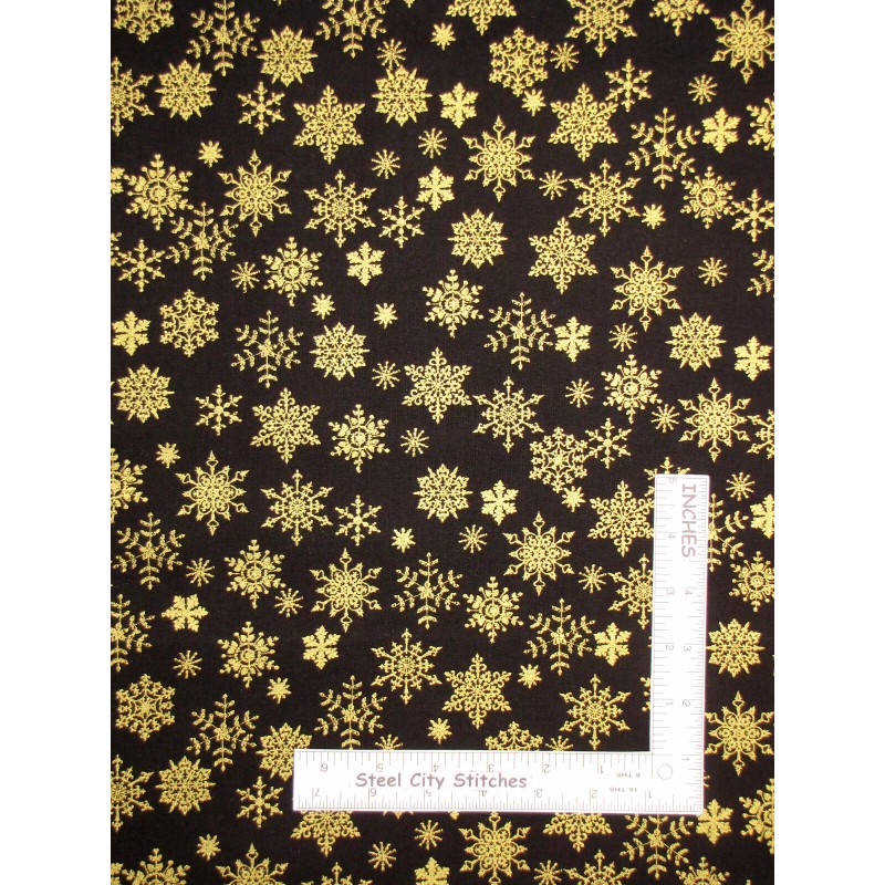 Santee Christmas Gold Metallic Snowflakes on Black Cotton Fabric #49802M03 By The Yard