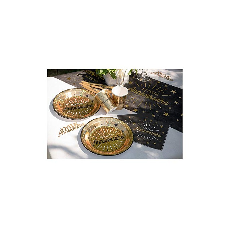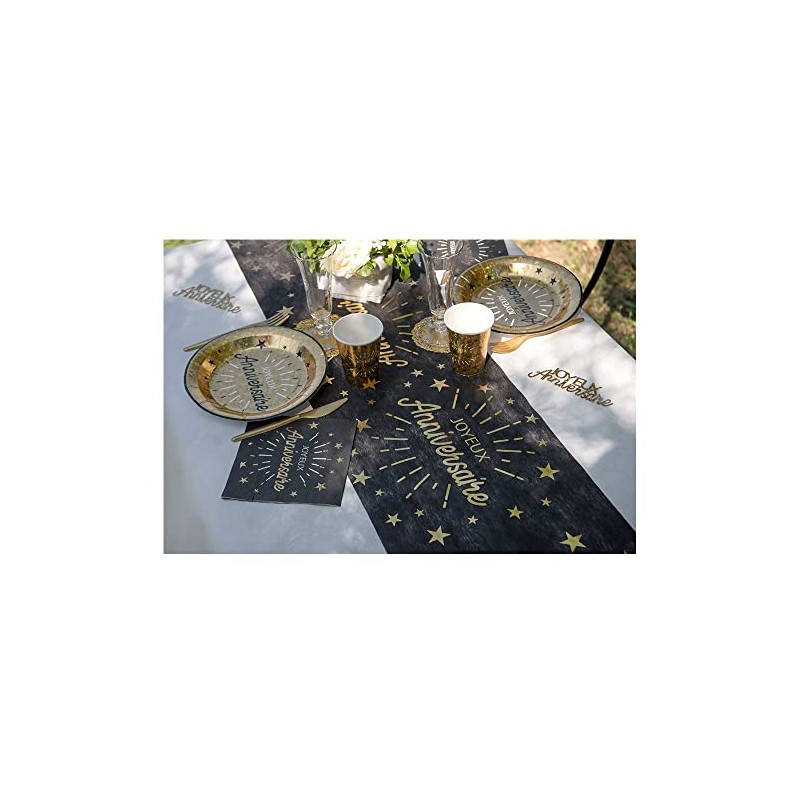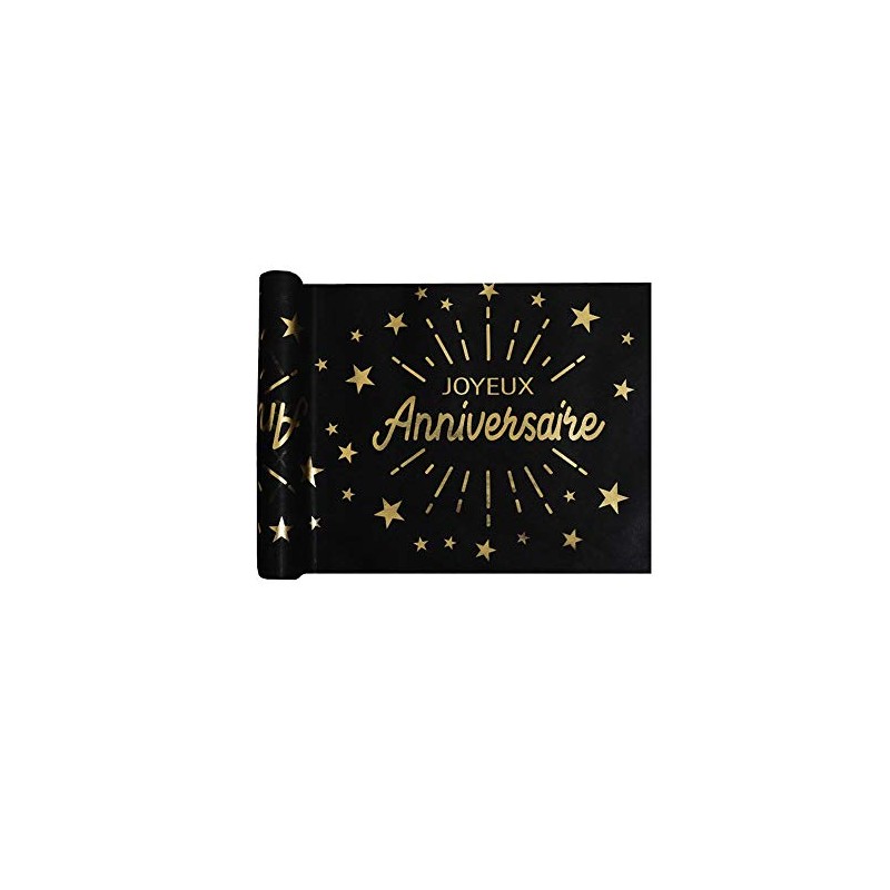 - Table runner made of synthetic fabric fibres with printed "Happy Birthday" accompanied by multiple stars in shiny gold on a black background