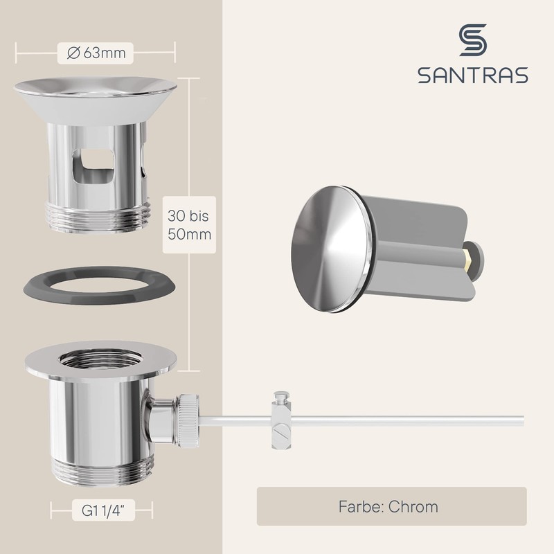 SANTRAS® Eccentric Drain Fitting Premium for Washbasin with Protection Against Overflow in Chrome - Complete Overflow Fitting with Drain Plug in 1 ¼ for Tap with Pop-Up Set