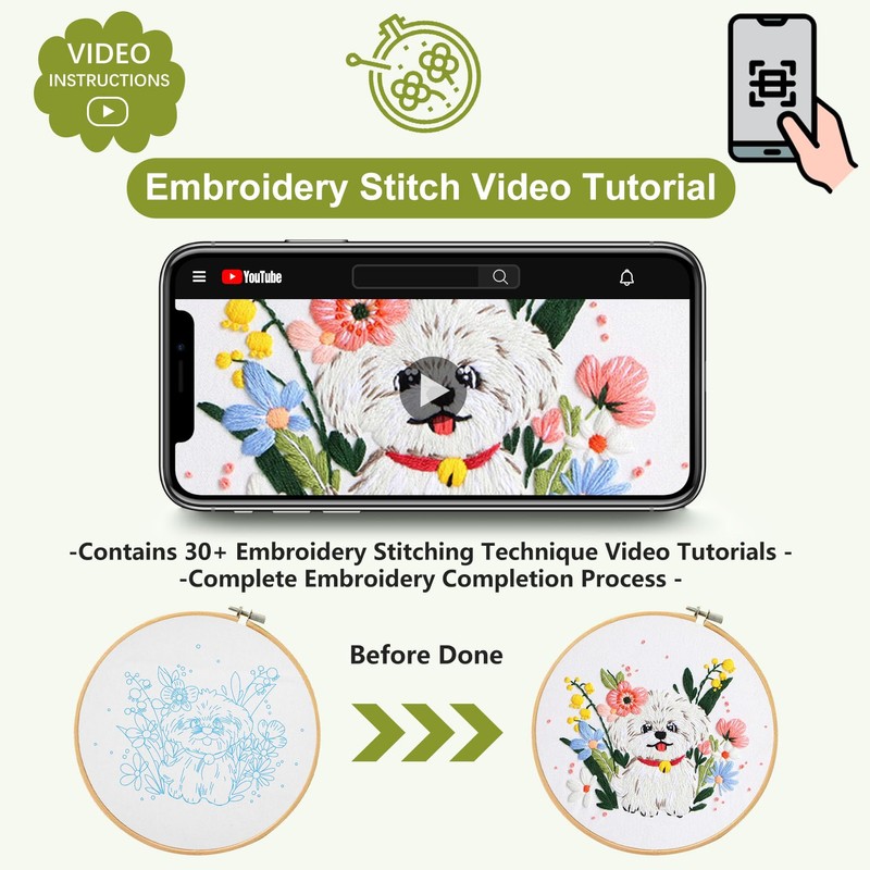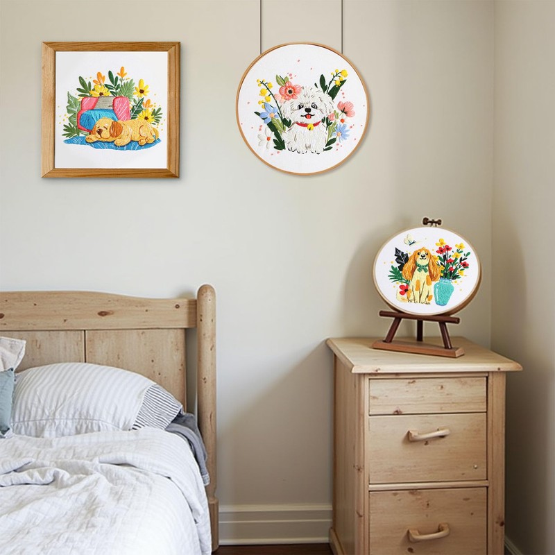- CUTE EMBROIDERY PATTERNS: This kit includes 3 dog & floral patterns printed on cloth, perfect for beginners. Follow the steps to complete each design, then wash away the water-soluble patterns for a clean, professional finish.