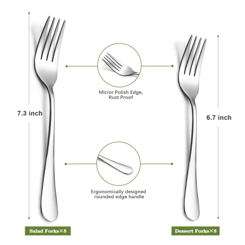 - Apto para lavaplatos: los tenedores de ensalada y los tenedores de crema están diseñados ergonómicamente, que tiene bordes lisos y pulidos en espejo para una sensación cómoda. Mientras tanto, este juego de utensilios de cocina tiene una estructura resistente, por lo que se puede utilizar durante mucho tiempo. Lo más importante es que los juegos de cubiertos son aptos para lavaplatos, por lo que puedes simplemente ponerlos en un lavaplatos para ahorrar tiempo en el lavado a mano.